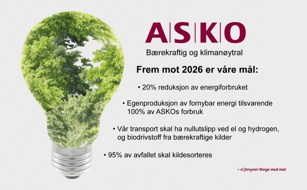 ASKO har en ambisjon om å bli bærekraftig og klimanøytral. Det betyr at de har fokus på energieffektiviserende tiltak, fornybare og bærekraftige ressurser og nullutslipp innen transport.